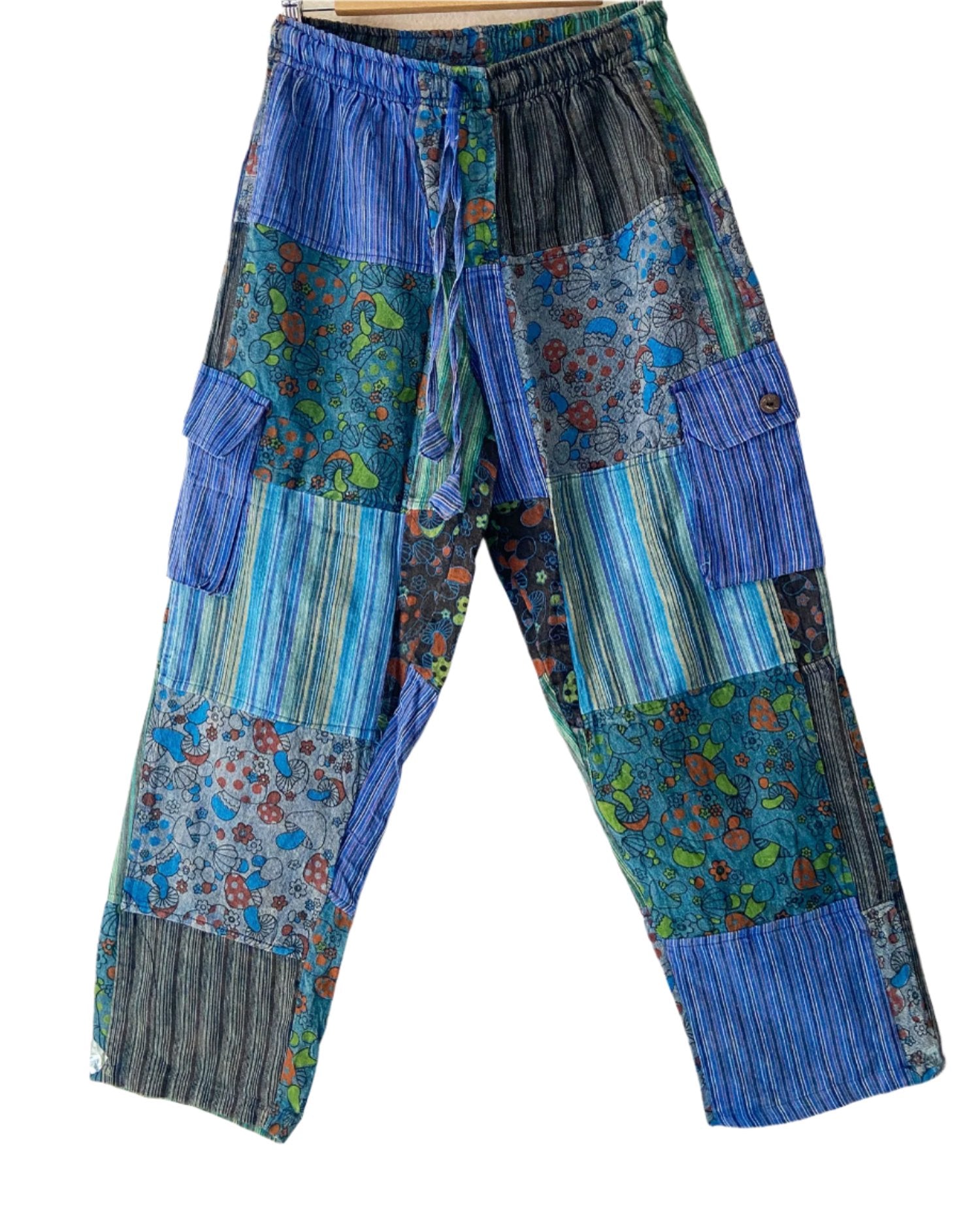 Expertly crafted in Nepal, these Mushroom Patchwork Cotton Trousers are the epitome of comfort and style. Made from stonewashed cotton, these trousers feature a full patchwork design in assorted colors and include two side pockets and two lower box pockets. Plus, they're ethically produced with Fair Trade practices. Upgrade your wardrobe with these unique and eco-friendly trousers.